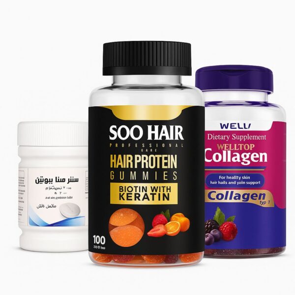 عرض الشعر من SooCare يجمع بين عبوتين جاميز للشعر الغني بالبيوتين والفيتامينات، مع عبوة سنتر فيتا بيوتين بتركيز 10000 ميكروجرام. تركيبة متكاملة لعلاج تساقط الشعر، زيادة الكثافة والطول، وتقوية الجذور. جميع المنتجات آمنة ومرخصة، لتستعيدي حيوية ولمعان شعرك بشكل طبيعي وفعال.